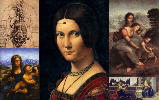 Resim. “Meryem’e Müjde” (1472-77, Uffizi Galerisi, Floransa), “Meryem’e Müjde” (y. 1472-77, Louvre Müzesi, Paris), “Karanfilli Madonna” (y. 1474, Eski Pinakotek, Münih), “Ginevra de’ Benci’nin Portresi” (y. 1475- 78, Ulusal Sanat Galerisi, Washington, D.C.), “Madonna Benois” (1478-1500’den sonra, Ermitaj, Leningrad), “Aziz Hieronymus” (y. 1480, Vatikan Müzeleri, Roma), “Müneccim Kralların Tapınması” (1481, Uffizi Galerisi, Floransa), “Müzikçi” (y. 1490, Ambrosius Resim Galerisi, Milano), “Erminli Kadın” (“Cecilia Gallerani”, y. 1490, Ulusal Müze, Kraköw, Polonya).