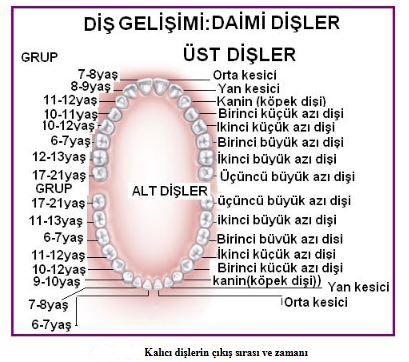Kalıcı dişler genellikle 6 ile 14 yaş arasında tamamlanır. Yalnız "akıldişi" olarak bilinen üçüncü büyük azıların çıkması 20-25 yaşına kadar gecikebilir; hatta bazılarında bu dört diş hiç çıkmayabilir. Geçici dişler arasında büyük azıların karşılığı ya da öncülü olmadığı için, bu 12 diş öbürleri gibi sütdişlerinin altında değil büyüyen çene kemiğinin gerisindeki boşlukta gelişir.