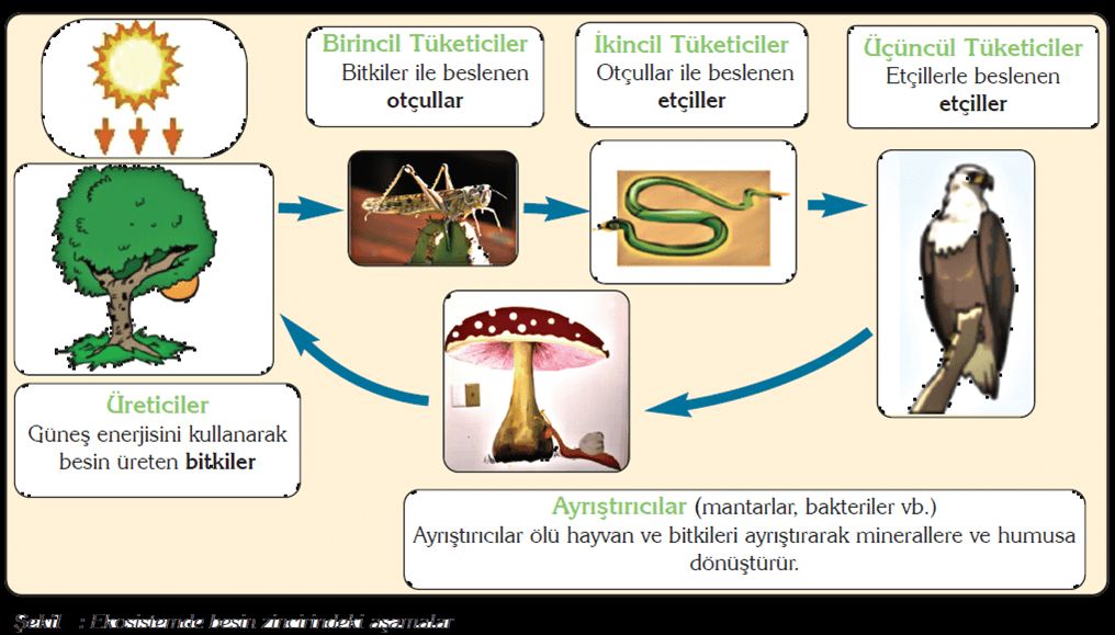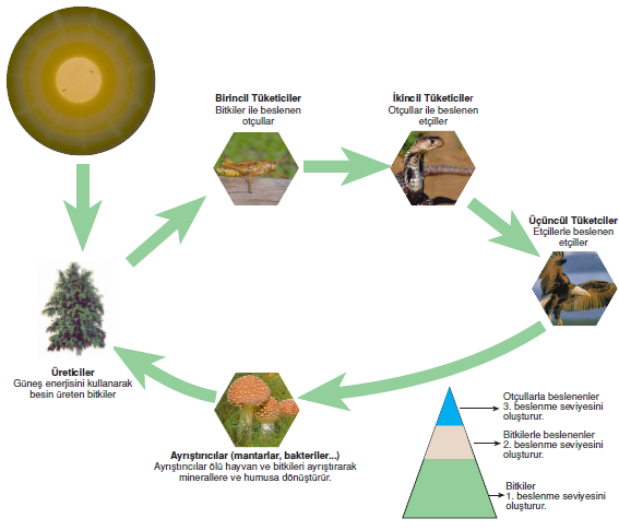 Bir ekosistemde yaşayan canlılar üçe ayrılır. Bunlar üreticiler, tüketiciler ve ayrıştırıcılardır. Bu üç canlı grubu arasında besin ve enerji akışı vardır. Bu akışa besin zinciri denir. Besin zincirinin ilk halkasını üretici olan yeşil bitkiler oluşturur. Yeşil bitkiler ihtiyaçları dışındaki besini depolar. Bu depo edilmiş besini otçullar alırlar. Otçulları da etçiller yiyerek enerjiyi ve besini almış olurlar. Böylece besin ve enerji zincirinin bir halkasından diğerine geçer. Her gruptan bir diğerine geçerken enerjide azalma görülür. Bu nedenle üst gruplara gidildikçe canlı sayısı azalır.