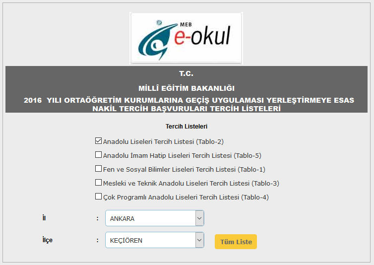Milli Eğitim Bakanlığı'nın e-okul sistemi ile bulunduğunuz ilçedeki liselerin taban puanlarını öğrenebilirsiniz. 2016 yılı için MEB e-Okul OGES Tercih sistemine aşağıdaki bağlantıdan ulaşabilirsiniz: