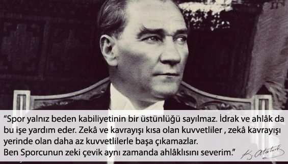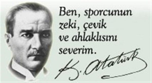 "Spor, yalnız beden kabiliyetinin bir üstünlüğü sayılmaz. İdrak ve ahlak da bu işe yardım eder. Zeka ve kavrayışı kısa olan kuvvetliler, zeka kavrayışı yerinde olan daha az kuvvetlilerle başa çıkamazlar. Ben sporcunun zeki, çevik ve aynı zamanda ahlaklısını severim." M. Kemal ATATÜRK