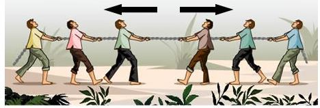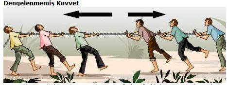 Yukarıdaki halat çekme oyununda zıt kuvvetler birbirine eşittir. Yani net kuvvet sıfırdır. Bu durumda hareket olmaz ve taraflar yenişemez.