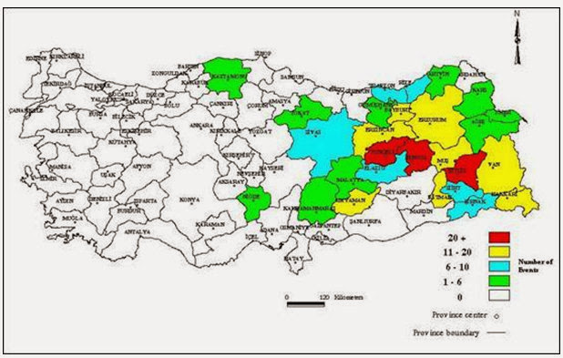 Değerlendirmelere göre, çığ olaylarının en fazla görüldüğü iller sırasıyla; Bingöl, Tunceli ve Bitlistir. Ölümcül çığ olaylarının büyüklüğü açısından sıralama; Şırnak, Tunceli, Bayburt, Hakkari, Bitlis ve Siirttir.