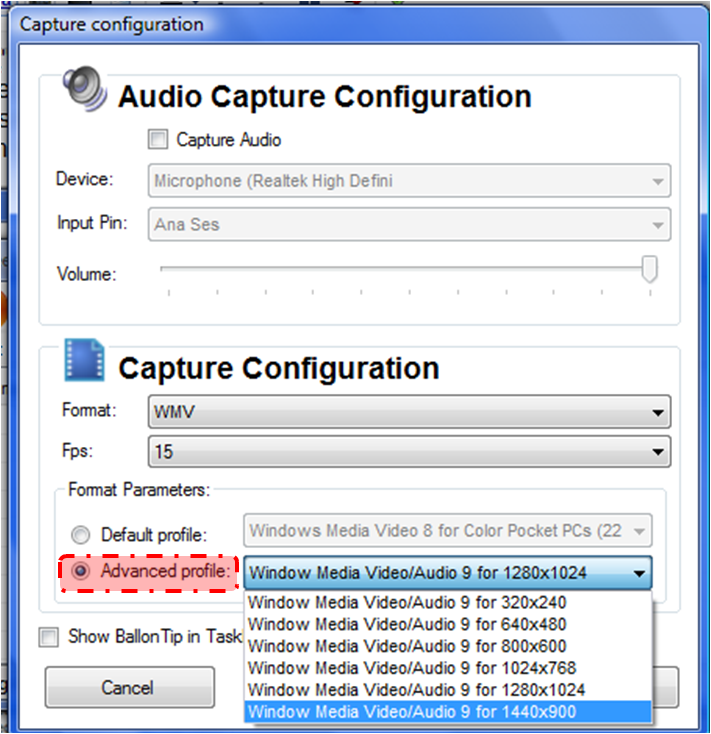 Yukarıda çerçeveli "Capture Audio" seçeneğini işaretlerseniz videoda sesiniz de çıkar. Yani mikfonunuz kullanıma açılır ve söyleyecekleriniz videoya çekilir. "Volume" bölümünden ses seviyesini ayarlayabilirsiniz. Eğer sesinizin çıkmasını istemiyorsanız "Capture Audio"