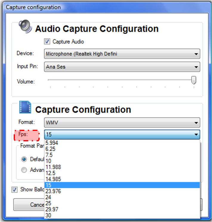 "Fps" bölümü ise saniyede gösterilecek kare sayısını gösterir. Yani 15 seçerseniz videoda 1 saniyede 15 resim gösterilir.