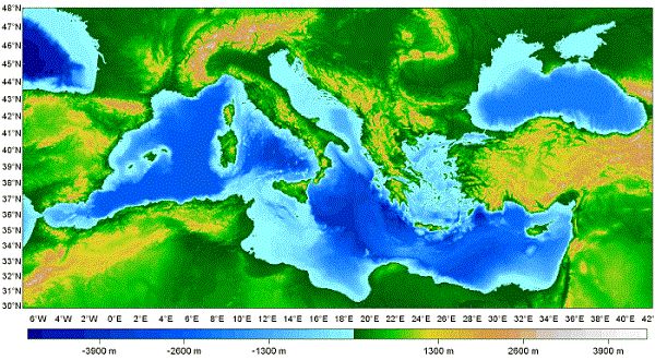Derin ve karalar arasına uzunlamasına sıkışmış bir çöküntüyü kaplayan Akdeniz, batıda dar ve sığ bir boğaz olan Cebelitarık’la Atlas Okyanusuna; güneydoğuda Süveyş Kanalıyla Kızıldeniz’e ve kuzeydoğuda Çanakkale Boğazı, Marmara Denizi ve İstanbul Boğazı yoluyla Karadeniz’e bağlanır. Akdeniz’in en büyük adaları Sicilya, Sardinya, Kıbrıs, Korsika, Girit, Mayorka, ve Rodos’tur. En derin yeri, Yunanistan’ın güneyinde İon Havzasında, deniz yüzeyinden 5.121 m aşağıdadır.