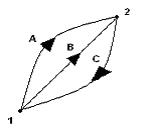 Şimdi bu şekilde sistemin herhangi iki hali görünüyor yani 1 ve 2 nolu noktalar. Hal değişimleri ise A , B , C çizgileriyle sağlansın. Ok yönleri de hal değişimlerinin olacağı yönler. Şimdi hal değişimleri 1A2 ve 1B2 ise 2C1 ilk hale dönülen durumdur. Şimdi çevrimleri kurguluyalım elimizde 1A2C1 ve 1B2C1 çevrimleri var: