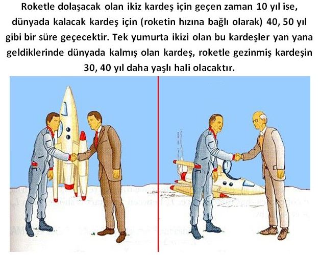 Buna göre ikiz olan kardeşlerden biri ışık hızı ile uzaya fırlatılsa ve 50 sene sonra Dünya'ya tekrar gelse Dünya'da kalan ikizin yaşı "x+50", uzaydan gelenin yaşı ise "x+50>gelen" olacaktır. Yani biri yaşlı biri genç ama bir çok bilim çevresi zamanda böyle bir yolculuğun ışık hızına dahi çıkılsa mümkün olmayacağını iddia eder. Çünkü eğer böyle olsa idi ışık sürekli geçmişe yol alır. Evrende sürekli yer değiştirmeyen ışık bütün evreni aydınlatırdı.Fakat atmosferimize çarpan mezonların 1sn lık anı, 10 dk gibi geçirdikleri ıspatlanmıştır"