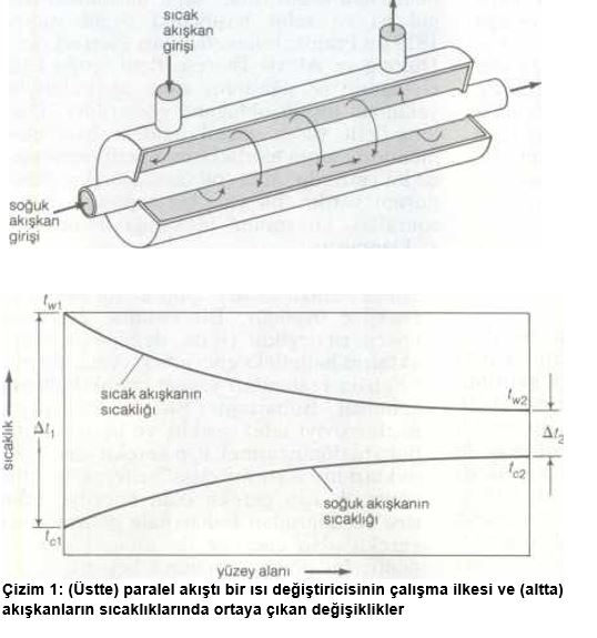 Çizim l’de, eşeksenel biçimde iç içe yerleştirilmiş iki borudan oluşan basit bir ısı değiştiricisi görülmektedir. Her iki boruya da akışkanlar için giriş ve çıkış ağızlan açılmıştır. Çizimde, soğuk akışkan ortadaki borudan; sıcak akışkan ise soğuk akışkanla aynı yönde olmak üzere iki boru arasındaki boşluktan akmaktadır. Bu akış düzenine paralel akış denir. Sıcak akışkandan soğuk akışkana ısı, içerideki borunun ısıtma yüzeyi denilen çeperinden aktarılır. Akışkanların sıcaklığı Çizim l’de (altta) gösterilen eğrilerin üzerinde değişir. Sıcak akışkanın sıcaklığı twı’den tW2 ye düşer; soğuk akışkanın sıcaklığı ise fcı’den tc2’ye yükselir. Bir akışkandan başka bir akışkana birim zaman içinde aktarılan ısı miktarı, Q=mc (t2~h) bağıntısına göre hesaplanır. Burada Q aktarılan ısı miktarı (kilowatt [kW] cinsinden), m birim zaman içinde akan akışkanın kütlesi (saniyede kilogram [kg/sn] cinsinden), c akışkanın özgül ısısı (ısınma ısısı) ve akışkanın ısı değiştiricisine girişinden çıkışma kadar sıcaklığında ortaya çıkan artış miktarıdır (santigrat [°C] cinsinden). Özgül ısı, kullanılan akışkanın türüne bağlı olan bir özelliktir. Sıcak akışkanın kaybettiği ısının soğuk akışkanın kazandığı ısıya eşit olması gerekir.