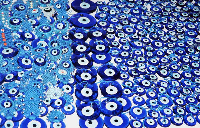 Ve gelelim en ünlü boncuk inanışına ,tabi ki nazar boncuğu.Onu anmadan boncuk konusu eksik kalır .Nazar değmesi inancı gözlerle ve bakmakla ilişkilendirilmiş tarih boyunca. Kökeni Sümerler’e, Babiller’e ve Eski Mısır’a uzanan nazar değmesi inanışına göre, insanın taşıdığı olumsuz düşünceler, fikrin dışarıya açılmış biçimi olan gözlerden dışarı çıkar. Bu da, bakışlarla olur. Buna, vurucu güç adı verilir. Vurucu gücü önlemek ve ondan korunmanın yolu ise, “göze gözle karşı gelmek” olmuş.Biz Türklerde de nazar inancı oldukça yaygındır. Bizdeki nazar inancının başlangıcı Orta Asya’ya Şamanizm dönemine uzanır. Geçmişte kötü bakışın, negatif enerjinin insanlara felaket getireceği düşünülmüş ve halen günümüzde de nazara inanan insanlar mevcuttur. Türkler, kötü bakışın önüne geçmek için pek çok nesne kullanmışlardır. At nalı, yumurta kabuğu, sarımsak, kuru diken, bez bebek, akik taşı, çocuk ayakkabısı, kaplumbağa kabuğu, kurt dişi, mercan, çörekotu, deniz kabukları, çakıl taşı, hurma çekirdeği ve son olarak irili ufaklı mavi nazar boncukları.Ülkemizdeki nazar değmesine karşı en sık kullanılan nesne nazar boncuğudur.