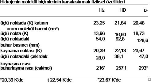 Döteryum molekülü ile hidrojen döterür molekülünün fiziksel özelliklerini normal hidrojen molekülüyle karşılaştırmak için bak. tablo.