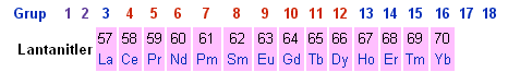 Lantanitler periyodik sistemin III’üncü yan grubunda bulunan “nadir toprak metalleri” olarak isimlendirilen metaller sınıfı olup bu metaller şunlardır: Ce Seryum - Pr Praseodim - Nd Neodim - Pm Pometyum - Sm Samaryum - Eu Europyum - Gd Gadolinyum - Tb Terbiyum - Dy Disprosyum - Ho Holmiyum - Er Erbiyum - Tm Tulyum - Yb İtterbiyum - Lu Lutetyum. Bu elementlerden yalnız Ce, Tb ve Pr 4+ oksidasyon sayısı da alabilirler. Diğerleri yalnız 3+ oksidasyon sayılı olabilirler. Nadir toprak metalleri, 3+ değerlikli halde birbirlerine çok benzeyen özellikler gösterirler. Elementlerin birinden diğerine geçişinde elektron değişimi 5 ve 6’ncı yörüngede olmayıp, sadece 4’üncü yörüngeye (4f) elektron katılması ile meydana geldiğinden, kimyasal karakter yönünden birbirlerine çok benzerler. Tabiatta çok az oranda monazit kumunda nadir toprak fosfatları halinde bulunurlar. Monazit, nadir toprakların ve toryumun bir ortofosfatı olup, (Ce, Nd, Pr, La) PO4(Th3PO44) formülü ile gösterilir. 3+ değerlikli nadir toprak metalleri beraber bulunduklarında bunlardan birini saf bir bileşik halinde izole etmek için, önce bu elementin bulunduğu grubu konsantre hale getirmek ve sonra elementi grup komşularından ayırmak gerekir. Nadir toprak metallerinin ayrılmaları, genel olarak, tuzlarının çözünürlüklerinin atom numarasını takiben artması veya azalmasına bağlıdır. 3+ değerlikli olan bu tür metalleri ayırmak için, ayrıca fraksiyonlu kristallendirme denilen ticari metoda da başvurulur. Nadir toprak metallerinin atom numaralarının artması ile bazik karakter azalır ve tuzlarının çözünürlükleri de artar. Bu metaller, kuvvetli elektropozitif olduğundan, üretimleri çok güçtür. Genellikle oksid ve fluorürleri karışımının elektrolizi ile karışım halinde elde edilirler. Bir çoğunun iyonlarının karakteristik renkleri vardır. Ayrıca birçok bileşikleri paramagnetik özellikler gösterir. Elde edilmeleri: Bu metallerin elde edilmelerinde erimiş klorürlerin elektrolizi, erimiş susuz klorürlerin metalik sodyum, potasyum, kalsiyum, mağnezyum veya alüminyumla indirgenmesi, amalgamların termik bozunmaları gibi metodlara başvurulur. Termik indirgeme ile ya metal veya alaşımlar elde edilir. Metallerin teknik ölçüde elde edilmelerinde kullanılan metod, erimiş halde bulunan ve kalsiyum, sodyum veya potasyum klorür ihtiva eden metal klorürlerinin elektrolizidir. Ticari ölçüde olmamak üzere, en saf metal veren metod, erimiş metal klorürlerinin, metalik kalsiyum ile indirgenmesidir. Erimiş metalde kalan kalsiyum, endüksiyon fırınında vakum tatbik edilerek uçurulur. Kaynak: Rehber Ansiklopedisi
