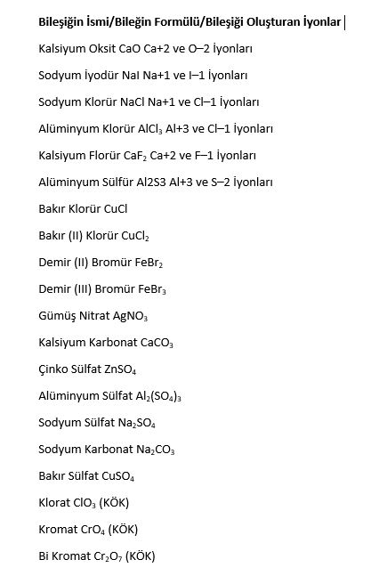 Atomların iyon bağıyla bir arada tutulduğu bu bileşiklerin başında tuzlar ve mineraller gelir. Bazı elementlerde atomların çekirdeklerinin elektronları çekme gücü öbür elementlere göre daha fazladır. Örneğin, bu tür bir atom olan klor, sodyum atomundan bir elektron alarak eksi yüklü iyon, elektron kaybeden sodyum atomu da artı yüklü iyon haline geçer ve bir iyon bileşiği olan sodyum klorür oluşur. Elektrostatik çekimle bir arada tutulan iyon bileşikleri genel olarak ortaklaşım bağlı bileşiklerden farklı özelliklere sahiptir. Bunlar genellikle erime noktalan yüksek, kararlı ve sert maddeler olma- lanna karşılık ortaklaşım bağlı bileşikler çoğunlukla sıvıdır ya da erime noktası düşük katilardır. Ancak, bu iki bağ tipi arasındaki fark mutlak değildir. Pek çok ortaklaşım bağı kısmen iyon bağı özelliği de gösterir.