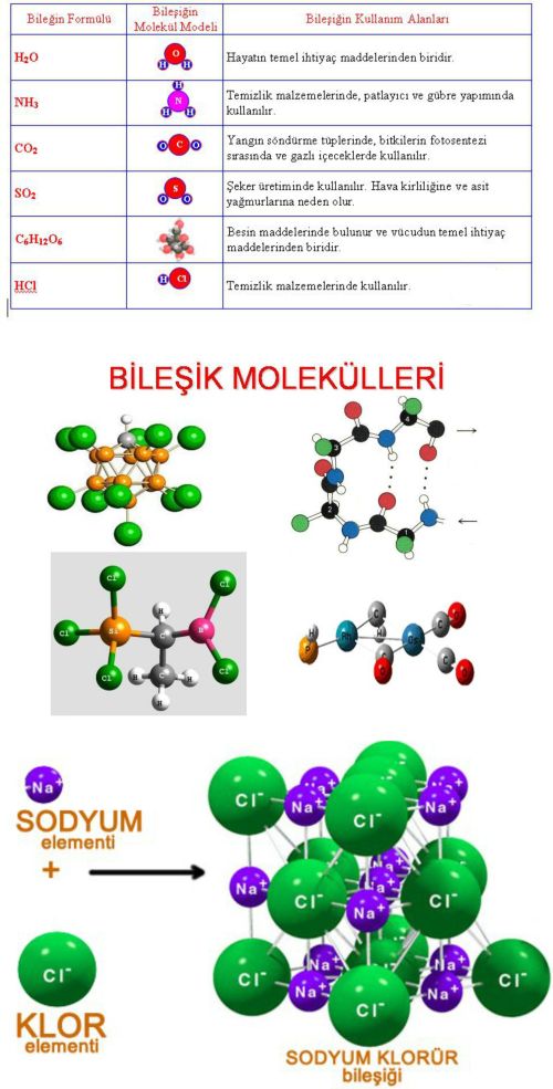 - Bileşikler oluştukları element atomlarının özeliğini taşımazlar. Örneğin tuz ikisi de zehirli olan sodyum ve klorürden oluşur. Fakat soframıza lezzetli yemek tuzu olarak gelirler. Su yakıcı olan oksijen ve yanıcı olan hidrojenden meydana gelir. Ama kendisi söndürücüdür.