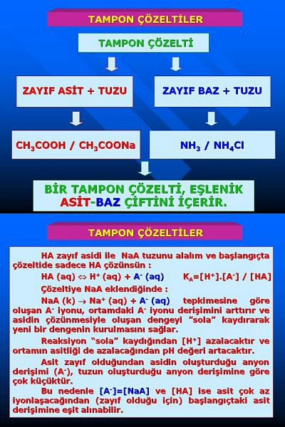 Zayıf bir asitle ( HA ) tuzunun ( A- ) tampon etkisi, hidrojen iyonlarının zayıf asidin A- bazı ile birleşerek iyonlaşmış HA moleküllerini vermesiyle açıklanır: