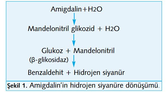 Amigdalin, asit ortamda daha yavaş hidroliz olur. Bu nedenle amigdalin içeren çekirdekler, mideden duodenuma geçerken alkali ortam oluştuğu için hidrolizle birlikte hidrojen siyanür ortaya çıkmaktadır. Siyanür bileşikleri İran-Irak savaşında olduğu gibi kimyasal silah olarak ya da Amerika Birleşik Devletleri’nin bazı eyaletlerindeki gibi ölüm cezası uygulamasında da kullanılmaktadır. Son yıllarda sıkça gündeme gelmesinin nedeni, altın işletmelerindeki kullanımıdır.