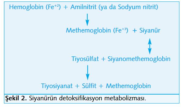 Yalnızca amil nitrit %5 düzeyinde methemoglobin üretmekte, istenilen düzey %40 olduğundan amilnitrit ve sodyum nitrit birlikte kullanılmaktadır. Siyanürün methemoglobine olan afinitesi, sitokrom oksidaza olan afinitesinden fazladır. Bu etkileşme ile siyanomethemoglobin ortaya çıkmaktadır.