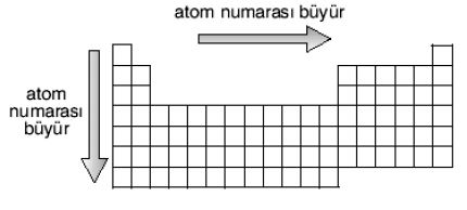 Günümüzde kullanılan sınıflandırmada elementler, artan atom kütleleri yerine atom sayılarına göre sınıflandırılmaktadır: bu da Mendeleyev’in yaptığı evirtimleri (Co/Nİ; Te/I; vb.) ortadan kaldırmıştır. En gelişmiş biçimiyle bu tablo, 18 grup (kolonlar) ile artan uzunlukta (2, 8, 8, 18, 18, 32) ve her biri bir soygazla sona eren 7 dönemi (sıra) içerir. Dönemler, elektron katmanlarının gittikçe artan bir biçimde doldurulmasına denk düşer. 4. dönemden başlayarak çeşitli katmanların üst üste binişmesi görülür (ATOM.) Bu tablo, dikey benzerlikleri ortaya kor: I A alkalileri, IIA toprak alkalileri, VII B halojenleri, soygazları; tablonun ortasındaki yatay benzerlikler ise, pek çok sıraya dağılmış geçiş elementlerini (skandiyumdan çinkoya, itriyumdan kadmiyuma, lantadan cıvaya, aktinyumdan lavrenciyuma) gösterir.