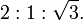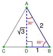 katıdır. İspatı ise eşkenar üçgen vasıtasıyla yapılır. Kenarları 2 cm olan bir eşkenar üçgende köşeden indirilen dikme kenarı iki eş parçaya bölecektir. Aynı zamanda da açıortay olacaktır. Kenarortay olduğu için oluşan dik üçgenin alt dik kenarı 1 cm olacaktır. Açıortay olduğu için de dik üçgenin bir açısı 30° olacaktır. Eşkenar üçgenin bir kenarı, oluşan dik üçgenin hipotenüsü olacağından yapılacak Pisagor bağıntısı ile de indirilen dikme