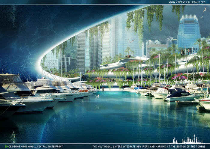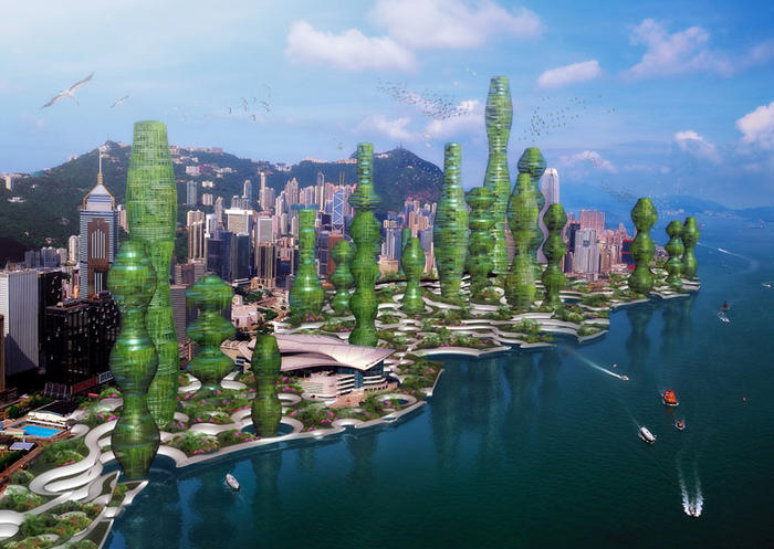 Hong Kong çok gelişmiş bir şehir olsa da havası müthiş kirli. Üstelik kilometrekareye 30 bin kişi düşecek kadar da kalabalık bir şehir. Bu iki soruna çözüm olması planlanan “Perfumed Jungle” (Parfümlü orman) tasarımı, Vincent Callebaut, Arnaud Martinez, and Maguy Delrieu’dan oluşan bir ekibin çalışması. Güney Çin Denizi’ndeki, Central Waterfront bölgesinde yapılması önerilen binaların bazıları karada, bazıları ise denizde yükselecek. Denizin ya da karanın altından onları gövde gibi birbirine bağlayan yapılardan dallar gibi yükselecekler. Kulelerin iç kısımlarında evler, dışa yakın kısımlarında ise bürokratik hizmet merkezleri olacak. Sadece manzaraya değil, fotosentenz yoluyla karbondioksit oranının düşmesine de katkıda bulunacaklar. Ancak bunların hepsi henüz öneri aşamasında. İnşaatına bile başlanmış değil.