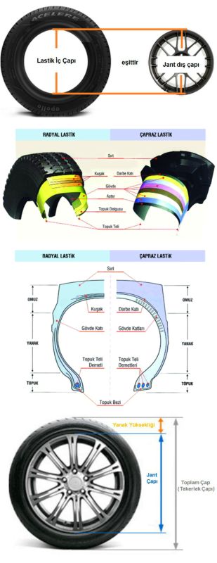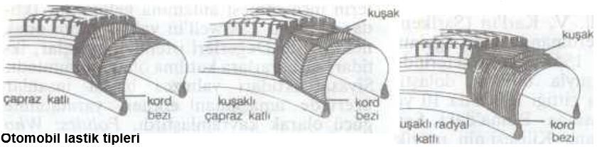 Lastikler, karkası oluşturan kablo katlarının yapısıyla birbirinden ayrılır. En eski tipi, çapraz ve eğik olarak üst üste yerleştirilmiş katlardan oluşan bias, diyagonal ya da çapraz karkas’tır. Radyal karkas’lı lastikte, karkas, düzlemi tekerleğin ekseninden geçen düz kemerler oluşturarak, bir ökçeyi diğerine bağlayan kablolardan (çelik ya da tekstil) meydana gelir. Gerçek anlamıyla karkas, çapraz yerleştirilmiş katlardan oluşan bir kuşakla sarılıdır; bu kuşak, dikine, yanlamasına ve boyuna büyük bir esneklik gösterir Radyal karkas, yuvarlanma tabanının yanaklarını ayırarak, her birinin bağımsız olarak görev yapmasını sağlar. Yanaklar kolayca esneyerek taşıtın konforunu artırır. Ayrıca bias ya da çapraz lastiklerin karkasları gibi, kayma kuvvetlerinin etkisinde kalmaz ve çok daha az ısınır. Yuvarlanma tabanı, yanaklann biçim değiştirmelerinden kaynaklanan kuvvetlerden etkilenmediğinden zemin bozukluğuna daha iyi uyum sağlar (böylece taşıta çok iyi bir kararlılık verir) ve daha az aşınır.
