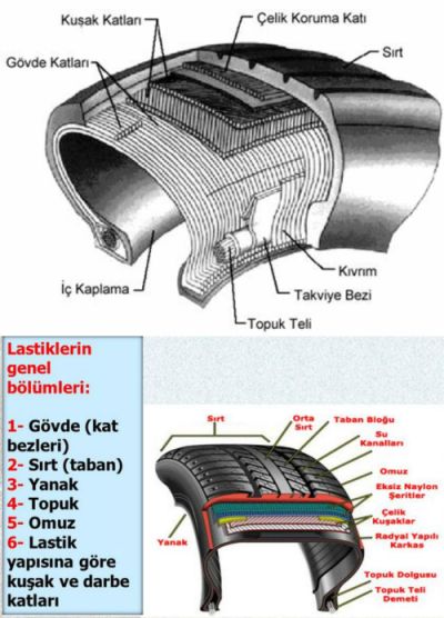 Bir lastik üç ana bölümden oluşur: zeminle temas eden kayma önleyici dişleri olan ve ıslak yolda bu dişlerin arasına de lan suyu boşaltan yuvarlanma tabanı; kauçuk kaplı bir ya da birçok tel ve kablo katından oluşan karkas; lastiğin janta takılmasını sağlayan ökçe Lastiği oluşturan esnek malzemeler yani karışımlar, doğal kauçuklar ya da farklı bileşimlerdeki bire şim elastomeleridir ve değişik işlevleri vardır: yuvarlanma tabanının aşınmaya karşı dayanımı ve zemine aderansı; yinelemeli ve almaşık eğilmelere maruz kalan lastik yanağının yorulmaya karşı dayanımı. Güçlendirici yükler (karbon siyahı), lastiğin, özellikle kopmaya ve aşınmaya karşı mekanik dayanımını artırır.