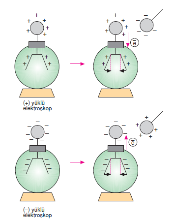 Elektroskop yüklendiğinde, her iki yaprakta aynı cins ve eşit yükle yüklenir ve birbirlerini iterek yapraklar açılır. Yapraklar arasındaki açı yük miktarı ile doğru orantılıdır. Yük miktarı artarsa, açı artar, yük miktarı azalırsa, yapraklar arasındaki açı da azalır. Buna göre, elektroskobun yüklü olup olmadığını, yaprakların açık olup olmadığından anlayabiliriz. Nötr bir elektroskoba bir cisim dokundurulduğunda, yapraklar açılıyorsa dokundurulan cisim mutlaka yüklü demektir. Dokunmayla elektriklenme sonucu elektroskopta yüklenir ve yaprakları açılır. Fakat bu durumda yükün işareti anlaşılamaz. Yükün işaretini anlayabilmek için, yükünün işareti bilinen bir elektroskoba yüklü cismi yaklaştırmamız gerekir. Şekildeki (–) yüklü elektroskoba K cismi yaklaştırıldığında yapraklar biraz açılıyor. Yaprakların biraz açılmasının nedeni, yapraklardaki yük miktarının artmasıdır. Yani topuzdan yapraklara (–) yükler itilmiştir. Topuzdan yapraklara (–) yüklerin itilebilmesi için K cisminin yükünün işareti (–) olmalıdır. Eğer K cismi yaklaştırıldığında elektroskobun yaprakları biraz kapanıyorsa, yapraklardaki yük miktarı azalıyor yani topuza yapraklardan yük çekiliyordur. Buna göre, K cisminin yükünün işareti (+) dır.