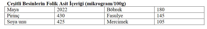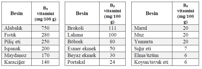 Yeşil yapraklı sebzelerde bol miktarda bulunur. Ayrıca brokolü, lahana, portakal ve tam tahıllarda da folik asitten zengindirler.