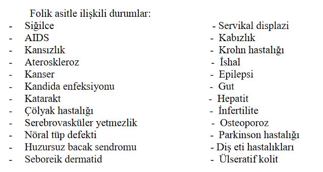 Folik asit desteği yukarıdaki tüm bozukluklarda fayda sağlayabilir. Ancak, folik asidin temel kullanım alanları nöral tüp defektlerinin oluşumunu önleme ve tedavisi, ateroskleroz, osteoporoz, servikal displazi ve depresyondur.