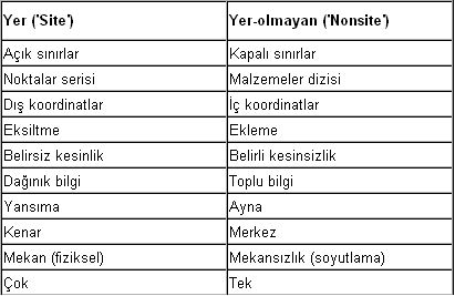 1960'larda 'bir çevre olarak sanat eseri' fikri, izleyicinin sadece bakmakla kalmayıp dünyada yaşadığı gibi sanat eserinin içinde 'yaşaması', hatta zaman zaman onun bir parçası olması beklentisini getirdi. Bu konudaki önemli kişilerden biri Robert Smithson'dır. Yer (daha büyük bir mekan içinde belirli bir yer) ve yer-olmayan (bu yerin galeride fotoğraf, harita, çeşitli malzeme ve dokümanlarla tekrardan sunumu) arasında bir ayırım yapmıştır. Bu ayrım önmeliydi çünkü Smithson ve Michael Heizer, Nancy Holt, James Turrel ve Walter de Maria gibi diğer arazi sanatçıları galeri dışında çalışmalarına rağmen işleri galeri sistemi tarafından sağlanan çerçeveye bağımlı kalmıştır. Smithson, yer ve yer-olmayan arasındaki on farkı aşağıdaki şekilde belirlemiştir: