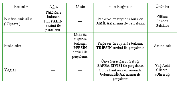 Besin içeriklerinden proteinler, karbonhidratlar ve yağlar büyük moleküllü (organik) besin içerikleridir (besinlerdir). Büyük moleküllü bu besin içeriklerinin hücrelerde kullanılabilmesi için kana veya hücre içerisine girebilecek kadar küçük moleküllere parçalanması yani sindirilmesi gerekir.