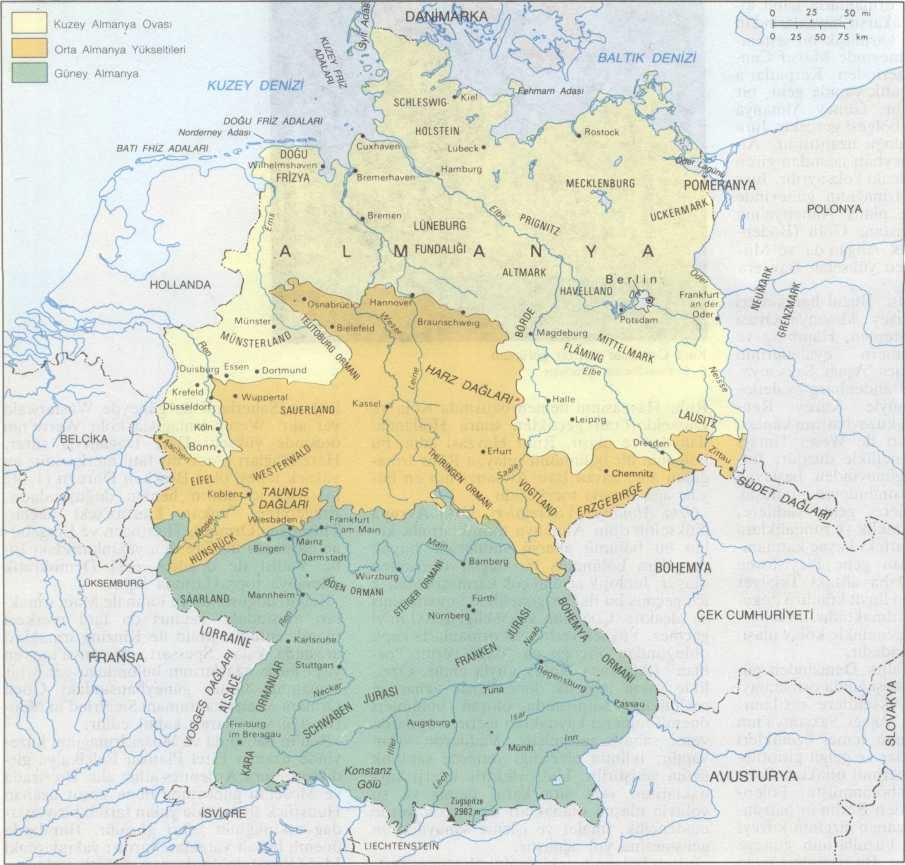 Kuzey Denizi ve Baltık'tan, güneyde Alpler'e kadar yayılan Federal Almanya toprakları, doğal peyzaj bakımından farklı bölgelere ayrılır. Kuzeyde, dördüncü zaman buzullarının izlerini taşıyan ovalar yayılır. Çoğu yerde kum ve killi katmanlarla kaplı, yer yer turbalıklar ve göllerle kesilen bu ovalar, patates ve çavdar dışındaki bitkilerin üretimine elverişli değildir. Düz ve alçak kıyılar; koylar; Weser, Elbe haliçleri gibi derin haliçler ve Kuzey Denizi'ndeki Frison, Baltık'ta Fehmarn Adaları gibi adalarla parçalanmıştır. Orta bölge genellikle engebelidir. Üstleri artık plato biçimini almış eski kitlelerle bunlar arasında kalan ve zemini alüvyonla örtülü havzalar birbirini izler. Platolar genellikle yoğun ormanlarla örtülüdür. Havzalar bölgenin başlıca tarım ve yerleşme alanlarını oluştururlar. Bu havzalar Rhein ve başlıca kolları Weser, Elbe ırmaklarının orta ve yukarı çığırlarıyla birbirlerine bağlanır. Güney Almanya, peyzaj bakımından çeşitlilik gösterir. Batıda, Vosges (Fransa) ve Karaorman Dağları arasında tabanı kalın alüvyonla örtülü Rhein Vadisi, daha doğuda, Rhein'in sağ kolları Neokar ve Main nehirleri vadilerinin yardığı Suab-Frankoni platoları yer alır. Alpler ile, bölgeyi batı-doğu yönünde kesen Tuna Irmağı arasında geniş Bavyera Platosu yayılır. Alpler'in kuzey sıraları Güney Almanya'da yer alır. Yeniden kuruluşundan bu yana geçen kısa dönemde,