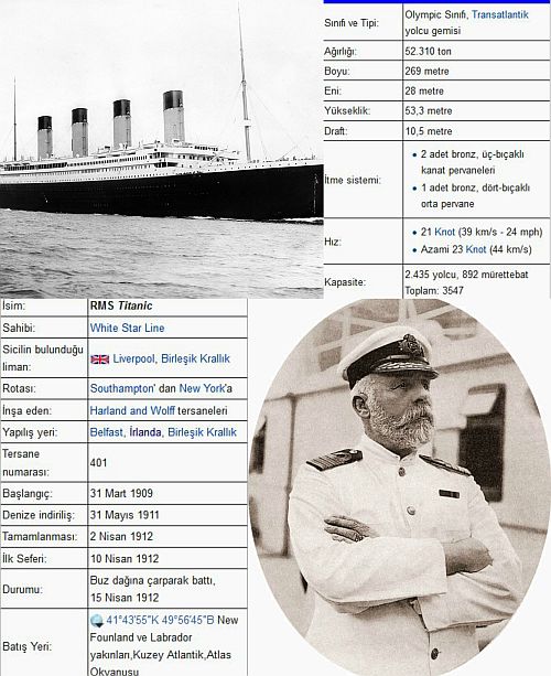 ilk seferi sırasında İngiltere’deki Soathampton’dan New York’a doğru yol alrken 14-15 Nisan 1912 gecesi Newfoundland’ın 640 km açığında bir buzdağına çaparak batan İngiliz yolcu gemisi. Kaza smucunda 1.515 yolcu yaşamını yitirmişti.