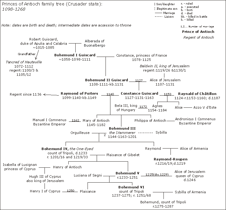 Doğu latin devleti; 1098'de Roberto Guiscardo'nun büyük oğlu Bohemond I tarafından kuruldu; hukuken Kudüs’ten de, Bizans imparatorluğu’ndân da bağımsızdı: Renauld de Châtillon bizans metbuluğunu ancak 1159'da kabul etti. Bohemond I ile Tancredi Antakya’yı güçlü birdevlet durumuna getirdiler (Lazkiye’nin alınması). Ceno- valılar'ın yardımlarını ödüllendirmek üzere, Bohemond I, Doğu'da italyanlar’a tanınan ilk ayrıcalığı onlara verdi. Bohemond ll’nin kızı Constance'ın evlenmesini izleyen uzun bir naiplikler ve prenslikler dönemi, prensliğin gücünü zayıflattı. Selâhattin Eyyubî, Hattin'deki ezici zaferinden (1187) sonra, kent dışında, hemen tüm prensliği ele geçirdi. 3. Haçlı seferi (1191-92), Suriye’deki latin devletleri yeniden canlandırdı. Bohemond III, küçük oğlunun Trablusşam kontu Raimond III tarafından evlat edinilmesini sağladı ve o da, 1201 ’de, yeğeni Raimond Rouben zararına, prenslik tacını haksız olarak ele geçirdi. Bu iki prens arasındaki sonucu belirsiz savaşlar, sonra da Bohemond IV ile oğlu Bohemono /'i, Rouben’ın ana tarafından bağlı olauğu Kilikia aşiretleriyle karşı karşıya getiren savaşlar prensliğin durumunu iyice bozdu. Sonunda Bohemond VI döneminde prenslik yitirildi (Antakya’nın 1268'de Memluklar tarafından ele geçirilmesi). Bağımsız Antakya prensliğinin, baronlar divanı, burjuvalar divanı, mühürdar, başkomutan, seneşal ve iki mareşal gibi, Kudüs krallığı ndan farklı, kendine özgü kurumlan vardı. Yasama kararlarıyla gelenek ve görenekler, "Antakya’nın temelleri” adlı bir yasalar derlemesi içinde toplanmıştı. Bugün elimizde bu derlemenin çeviri bir metni vardır. Prenslik, vasallerin —genellikle norman —.kökenleri ve prensin vasaller üzerinde sürdürdüğü denetim bakımından olsun, güçlü merkeziyetçiliği bakımından olsun, kendi norman kökenlerinin izlerini hep korudu. 1193 ekiminde bir “Antakya komünü” kuruldu. Antakya prensliği parlak bir uygarlığa erişti: Gautier le Chancelier prens Roger’in yiğitliklerini dile getirdi; Batı'da iki Chansons d'Antioche yazıldı, ama Raimond de Poitiers tarafından ısmarlanan Chanson des chĞtits Suriye’de oluşturuldu. Antakya'nın ticareti XIII. yy.'a kadar, ayrıcalıklarını artırmak için prensler arasındaki rekabetlerden yararlanan Cenovalılar ile Pisalılar’ ın elinde kaldı. Ama ticaret yollarının kuzeyde Kıbrıs-Kilikia, güneydeyse (Türkler’in eline geçen) Halep-Lazkiye eksenlerine doğru kayması üzerine, bunların Doğu ile Batı arasındaki mübadele ticaretleri geriledi.