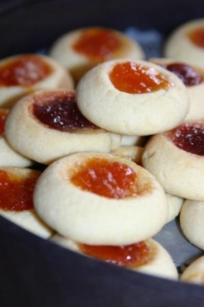 Erimiş tereyağı ile şekeri çırpın içine badem, yumurta sarısı ve unu ilave edip hamur yapın. Bu hamuru elinizle yuvarlayıp ortasına parmağınızla bastırarak boşluk açın ve yağlanmış tepsiye dizin. Açtığınız boşluklara kayısı reçelinden pay edin. En sona da kar ettiğiniz yumurta aklarından sürün ve 160derecede pişirin.