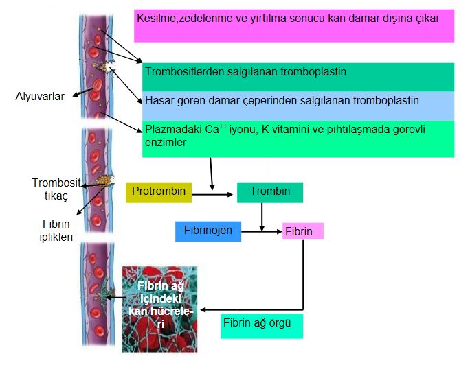 c. Trombinin fibrinojene etki ederek fibrin ipliklerini oluşturması. Fibrin iplikleri kan hücrelerini ve plazmayı içine alarak bir kitle oluşturur, buna pıhtı adı verilmektedir.