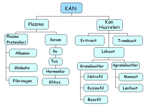 Kan, hücrelerden ve “plazma “ adı verilen bir sıvıdan oluşmuştur. Hücreler eritrositler (kırmızı kan hücreleri), lökositler (beyaz kan hücreleri) ve trombositlerdir. Hücrelerin % 99’undan fazlasını eritrositler oluşturur. Eritrositler kanın oksijen taşıyan hücreleridir.Lökositler vücudu enfeksiyonlara ve kansere karşı koruyan hücrelerdir. Trombositler ise kanın pıhtılaşmasında görev alırlar.