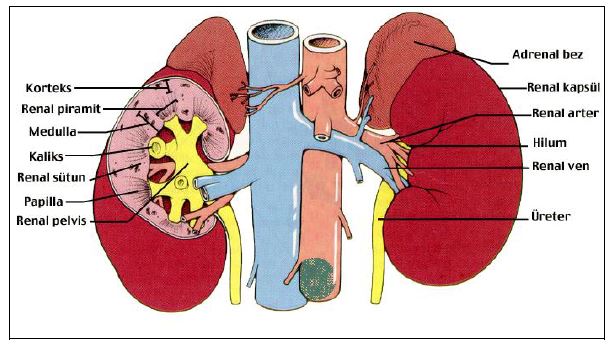 Böbrek kesiti incelendiğinde üç farklı yapıdan oluştuğu görülür.