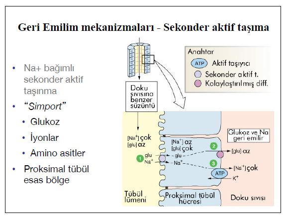 Tubuluslardan aktif taşınma ile geri emilen maddeler için bir eşik değer söz konusudur. Bu duruma en iyi örnek glukoz taşınmasıdır. Kan glukoz konsantrasyonu normal olduğu zaman glomeruslardan filtre olan glukozun hepsi prosimal tubulus bölgesinde aktif taşınma ile geri emilir ve idrara hiç glukoz çıkmaz. Kan glukoz konsantrasyonu normalden yüksek olduğu zaman aktif taşımada görev alan taşıyıcı moleküllerin doygunluğa erişmesi sonucu glukozun fazlası geri emilemez ve glukoz idrara çıkar. Geri emilemeyip tubulus sıvısı içinde kalan glukoz fazlası, ozmotik güç yaratarak suyu da beraberinde sürükler. Diabetli hastalarda poliüri görülmesinin nedeni de budur.