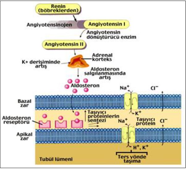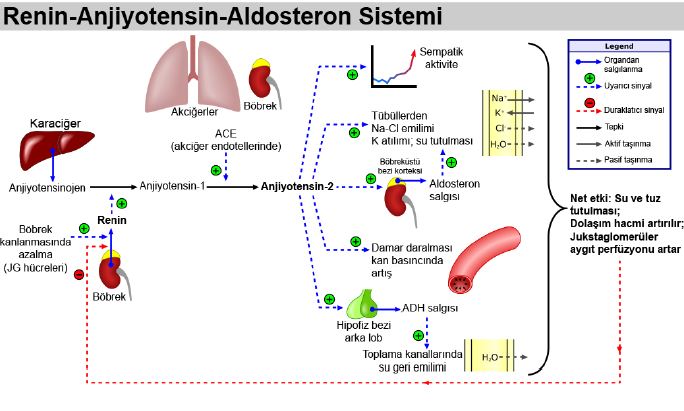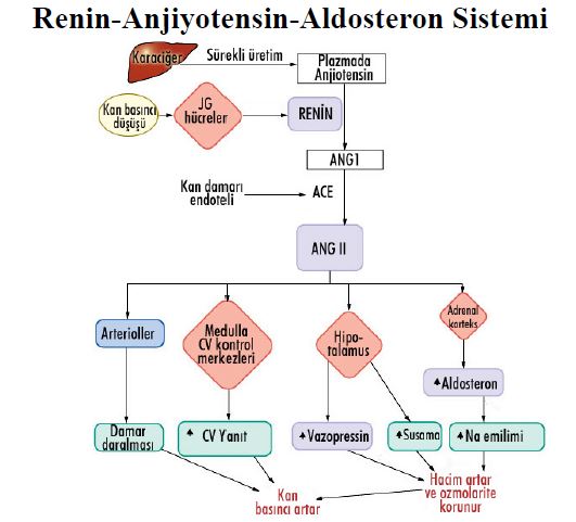 anjiotensin I; akciğerlerde, pulmoner endotelde bulunan bir konverting enzim aracılığı ile angiotensin Il’ye dönüşür. anjiotensin Il’nin sürrenal korteksten aldesteron salgısının artmasını sağlayıcı etkisi de vardır.