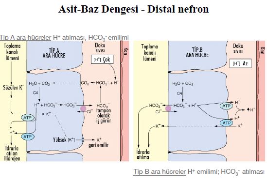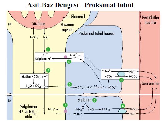 tepkimesi gerçekleşir.Burada oluşan H+ iyonu tüpçük sıvısına verilirken Na+ iyonu kanalcık hücrelerince alınır.kanalcık hücrelerindeki HCO3 ve Na+ iyonları kana geçerek kan pH ının düzenler.