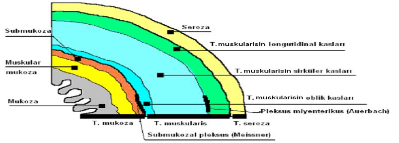 T. Muskularis iki katmanlı düz kas hücrelerinden yapılmıştır. İçte sirküler dışta longitudinal tabaka bulunur. En kalın kas pilorusta bulunur çünkü pilorus sfinkterini oluşturacak sirküler katman çok kalınlaşmıştır. Longitudinal ve sirküler kaslar arasında pleksus myenterikus (Auerbachii), sirküler kas ile lamina muskularis arasında pleksus submukoza (Meissneri) denilen sinir ağları bulunur.