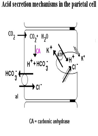 - Parietal hücre içinde su, carbonik anhydrase (K.A) enzimi aracılığında H+ve OH' iyonlarına ayrılır.