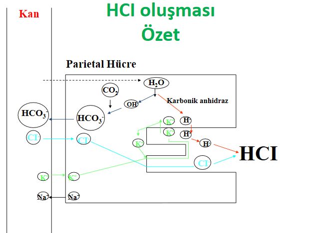 Kandan alınan Cl yerine kana verilen HCO3 parietal hücre protoplazmasında yapılır. Karbonik