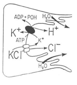 - H+ aktif biçimde, hücrenin kanal sistemine verilir. ATP ile çalışan aktif transport olayında kanal sistemine verilen her H+ için kanal lümeninden bir K+ protoplazmaya alınır, yani H+ ve K+ yer değiştirir.
