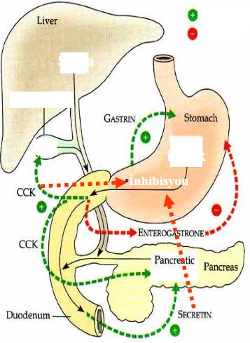 - CCK (cholecyctokkinin); mideden de salınır, mide salgı ve hareketlerini inhibe eder.
