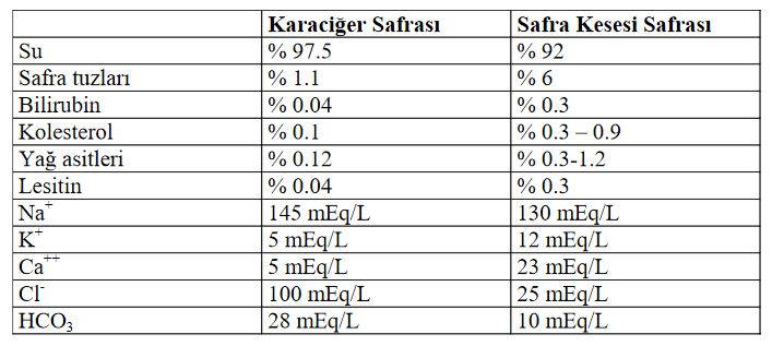 - Sekretorik ve ekskretorik ürünlerin bir karışımı olan karaciğer safrasının reaksiyonu hafif alkali olup (pH 7.68-8.15), katı madde miktarı %3 dolayındadır. Safra kesesi ise nötr, bazen de hafif asit olabilmektedir.