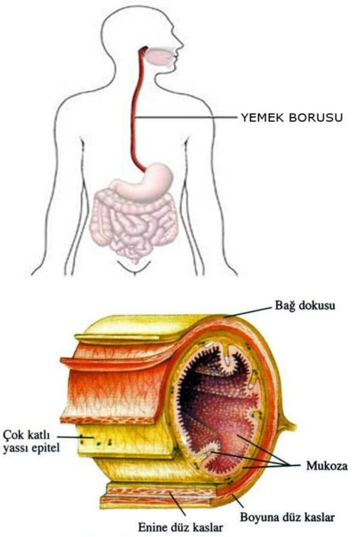 Yenilengıdalarınağızdan sonraki geçiş bölgesi, boğaz. Yenilen gıdaların ağızdan sonraki geçiş bölgesi, boğaz. İçten dışa doğru örtü epiteli, düz kas ve bağ dokudan oluşmuştur. Besinler yemek borusundan geçerken yemek borusu peristaltik hareketler yapar. Yemek borusunda sindirim gerçekleşmez.Besinler yemek borusundan mideye geçiş yapar.Yemek borusu ağız ve mideyi birleştirir.Besinler yemek borusundan geçerek mideye ulaşır. Hazım kanalının başlangıç kısmı. Yetişkin bir şahısta boyu 25 cm kadar olup, üç kısımdan teşekkül eder: