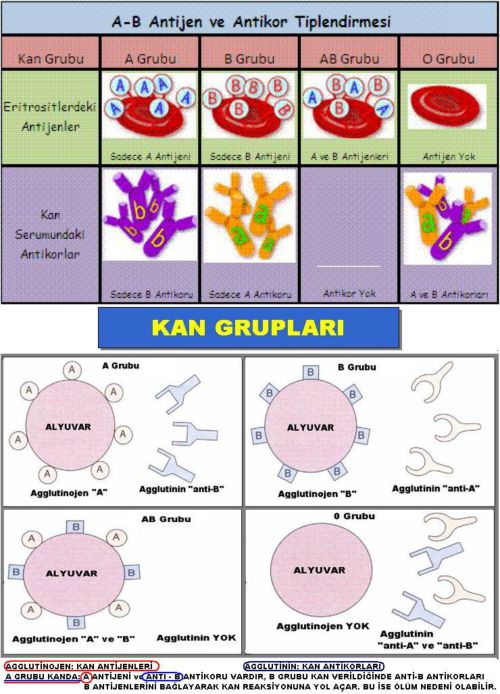 Kan grubunu belirleyen A ve B genleri, kanınızda bulunan alyuvarların çeperinde A ve B tipi proteinlerden hangisinin yer alacağını belirlerler. Kan grubunuz A ise alyuvarlarınızın çeperinde yalnızca A tipi protein, B ise yalnızca B tipi protein, AB ise her ikisinden de, 0 ise alyuvarlarınızın içinde her ikisi de yoktur demektir. Alyuvar çeperinde bulunan ve kan grubunuzun belirlenmesinde rol oynayan bu proteinlere aglütinojen denir. Ancak kanda, kendinizinkinden farklı bir kan grubuna ait alyuvar hücrelerinin vücudunuza girmemesini sağlayarak sizi koruyan aglütinin adlı antikorlar bulunur. Protein yapısında olan aglütininler de tıpkı aglütinojenler gibi A ve B tipinde olurlar.