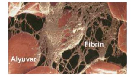 Fibrinin dış yüzeyinde yapışkan parçalar bulunur. Yaranın olduğu bölgede bu molekül yapışkan özelliğinden dolayı diğer fibrin moleküllerine yapışır ve uzun bir zincir meydana gelir. Oluşan bu zincirler birbirlerinin üstünden geçerek balık ağına benzeyen bir pıhtı ağı oluştururlar. (Bu olayı da örümceklerin ağ örmesine benzetebiliriz.) Oluşan bu pıhtı ağı kan hücrelerinin vücuttan dışarı çıkmasını engeller.